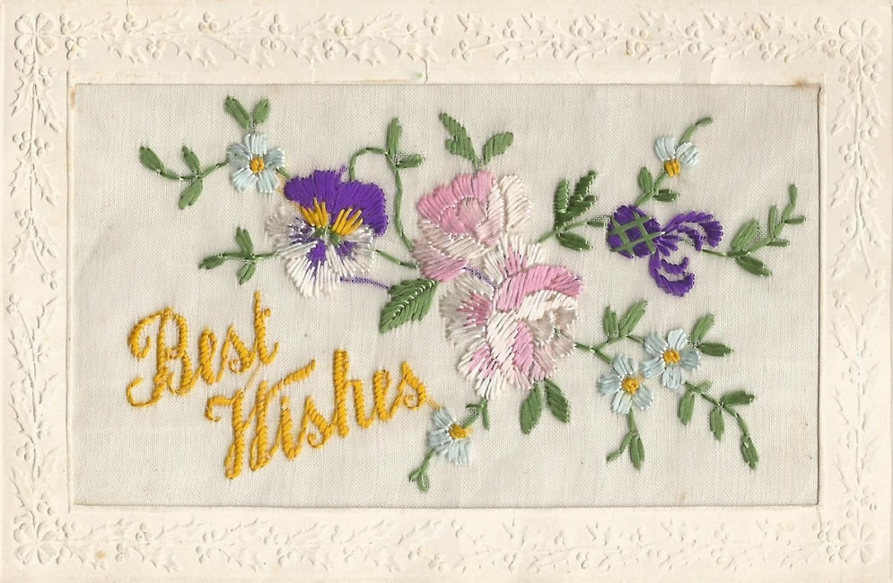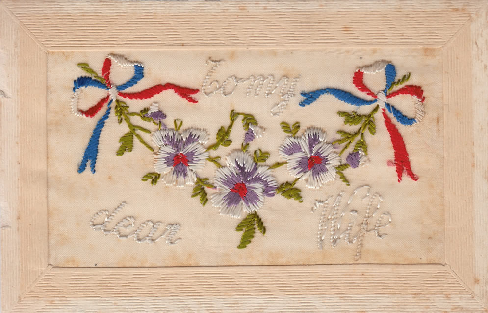 The embroidered designs were mass produced in factories in Paris and sent to French or Belgian women who lived just behind the front line. They cut them up, glued the designs to a piece of card and sold them to the soldiers.