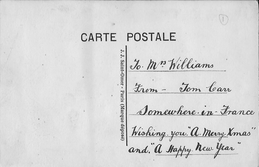 A silk First World War Christmas card sent from Tom Carr, ‘somewhere in France’ to wish Mrs Williams a Merry Christmas