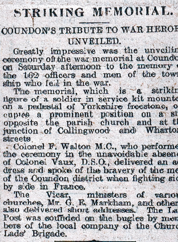 Coundon is a mining village a couple of miles east of Bishop Auckland. Its memorial, said the Echo, was “a striking figure of a soldier in service kit mounted on a pedestal of Yorkshire freestone”.