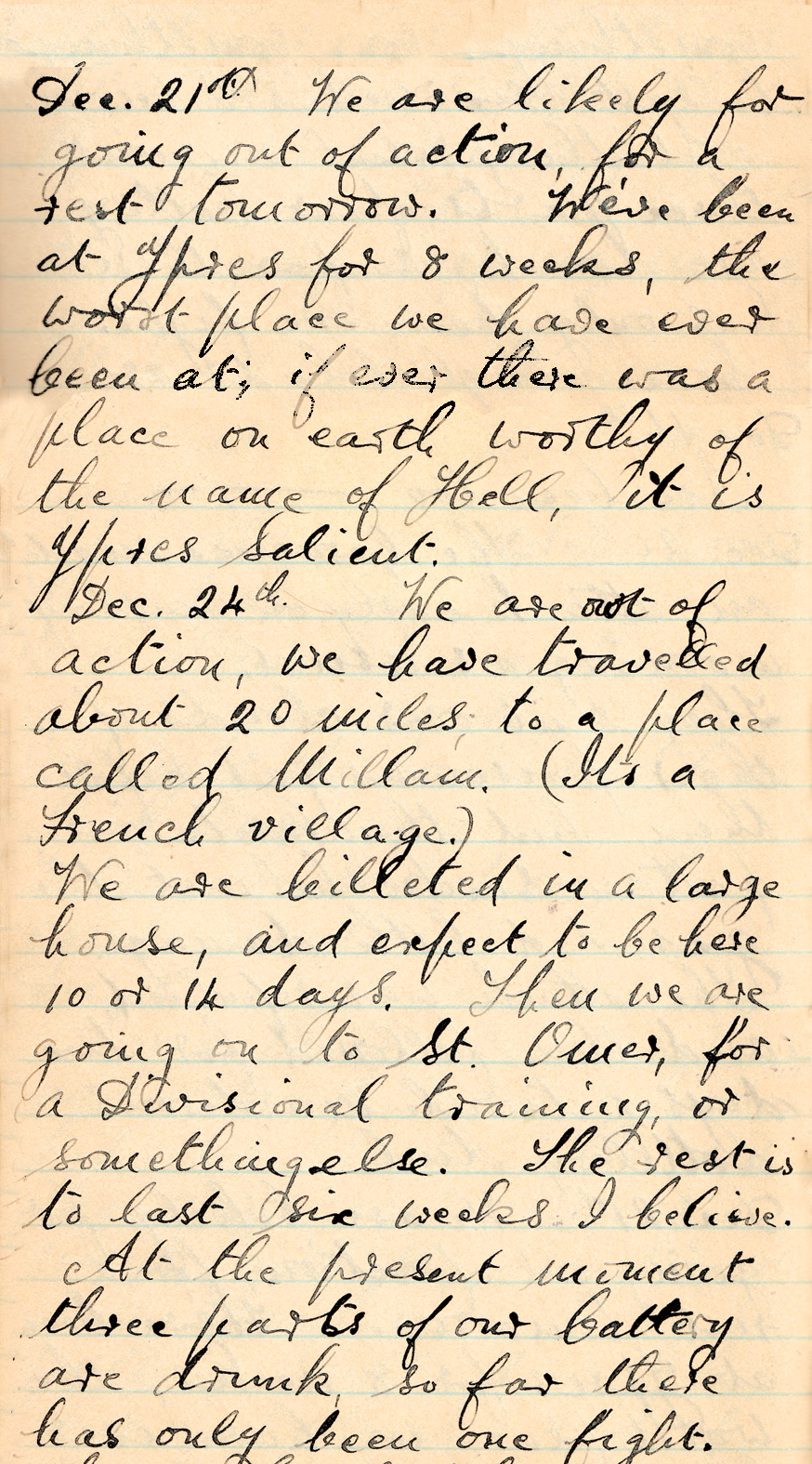 We are billeted in a large house and expect to be here 10 or more days. Then we are going on to St Omer, for divisional training or something else. The rest is to last six weeks I believe. At the present moment three parts of our battery are drunk, so far there has only been one fight. Some English lads are singing Home Sweet Home, some Scotch men are singing of Bonnie Scotland, (and a group?) of Irishmen are singing of the Emerald Isle. They are telling each other of their dear old mother and father, of their sisters and sweethearts. They are thinking of old times. It’s Christmas Eve. The time of peace on earth and goodwill towards man.