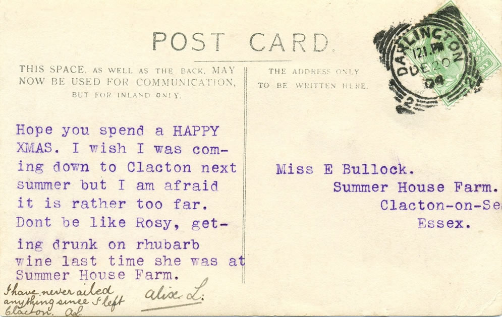 I hope you spend a HAPPY XMAS. I wish I was coming down to Clacton next summer but I am afraid it is rather too far. Don’t be like Rosy, getting drunk on rhubarb wine.