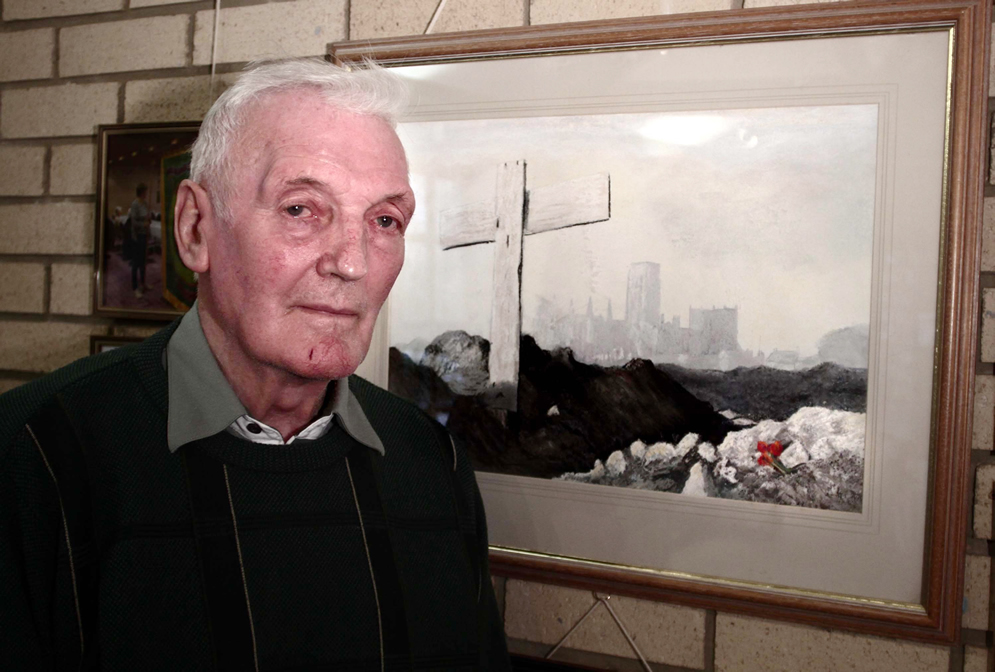 Artist Bob Ord and his painting in memory of soldiers shot at dawn